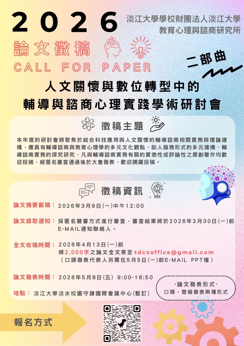歡迎踴躍投稿~~2026人文關懷與數位轉型中的輔導與諮商心理實踐學術研討會:二部曲